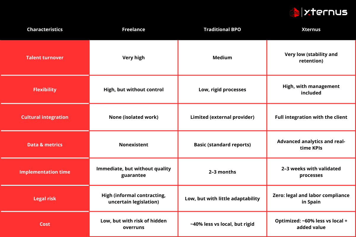 In this comparison we analyze three key alternatives (freelancers, traditional BPOs and Xternus) to help you make informed decisions.
